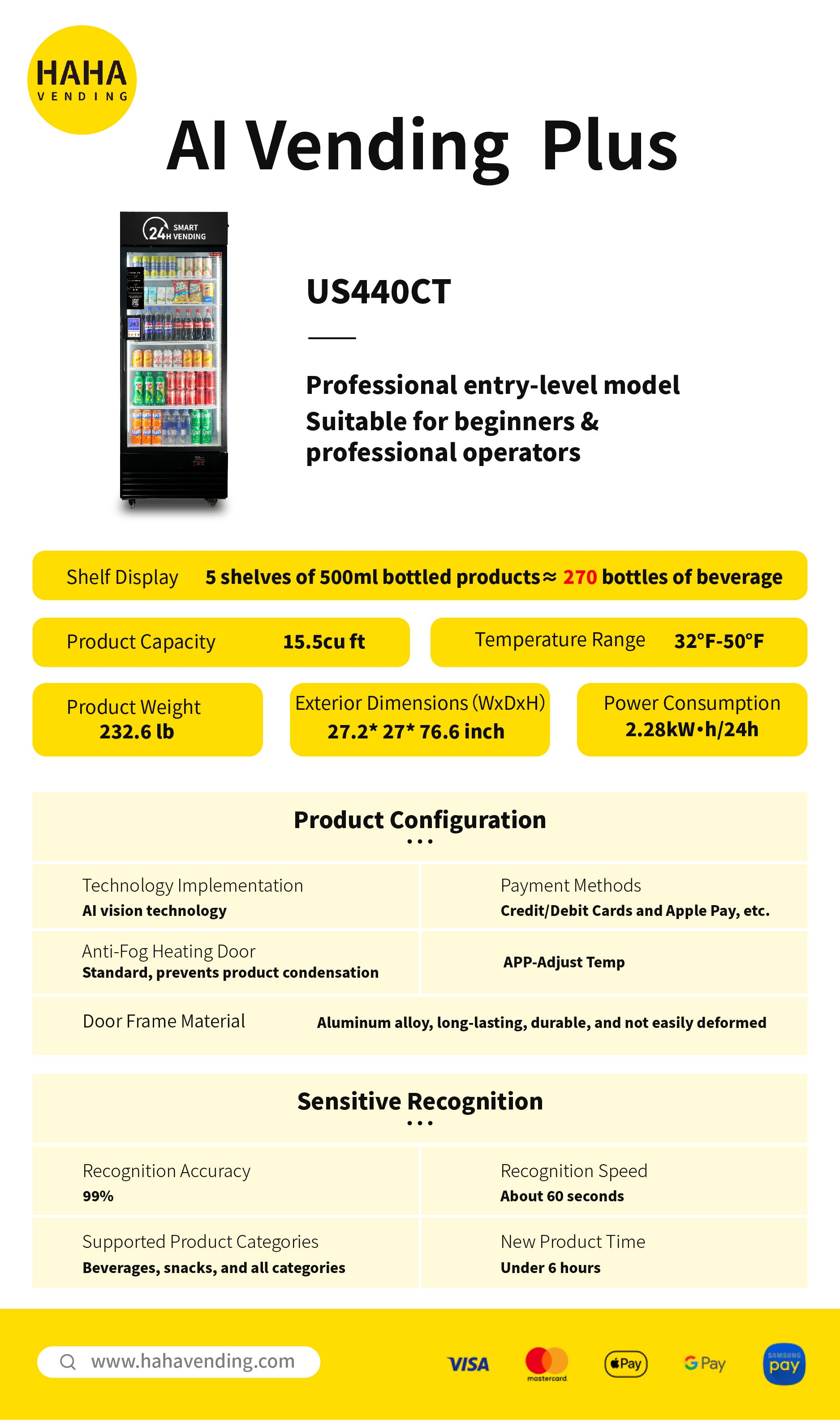 Customers enjoy seamless, cashless transactions through credit/debit cards, Apple Pay, Google Pay, Samsung Pay, and more. With fast recognition speed (about 60 seconds) and new product setup in under 6 hours, the HAHA AI Vending Cooler Plus 440 is built to streamline operations, boost sales, and deliver a modern vending experience.
